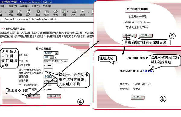 ⑥注册成功,返回到①处输入卡号密码进行付款操作。