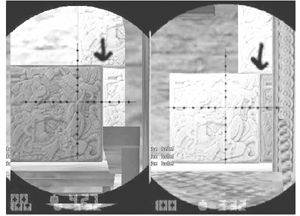 1.从这张AWP双倍镜的抓图中,我们可以观察到原来1.5版本中两块岩石之间的那条缝在新版本中被取消。这条缝于T和CT都是一个极微妙攻击线路,不过以后那些巧妙利用细缝的经典打法都将变成回忆。笔者个人观点是这个变化对T有利,至少保证了洞门口到石头后面这段路不会被CT发现而遭受穿透打击(图1)。