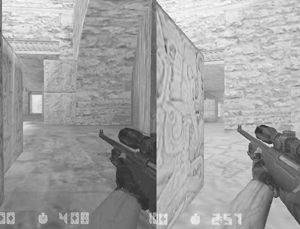 10.老版本的水路由于CT能先看到T的脚,因而意味着可以提前半秒左右时间攻击,这个优势在高水平的对抗中是致命的(图10)。新版本修改了一些细节以弥补对T的不利,把水路的颜色加深给T提供保护色,还增加了几根水草做掩护,但是这些就足够了吗?