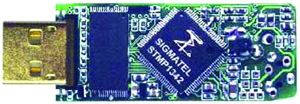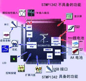 SIGMATEL公司的STMP1342芯片是一款MP3型闪存常用的控制芯片(图1、图2),这款芯片集MP3、可变比特速率(VBR)MP3音乐格式文件、WMA格式解码、NAND 闪存、SmartMedia、MMC和Secure Digital卡读取、ADPCM 格式语音录音、Firmware、USB闪存控制功能于一身,节省了空间和成本。不过与传统的MP3播放器使用的控制芯片相比,缺少如LCD、遥控器、锂电池、FM调频器、线性输入等功能的支持,所以市场上MP3型闪存在MP3功能上还稍有欠缺,比如不支持FM收音、不能扩展容量,集成USB接口后稍显偏大等问题。同时MP3型闪存价格低廉的原因也在于此!