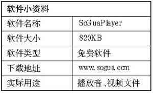 现在各种格式的媒体如雨后春笋般涌现,如果播放器不支持某种格式的媒体,那么你就无法打开相应格式的媒体文件,例如Media Player在不下载相应插件的情况下就无法播放RM格式的影视文件。而SoGuaPlayer就充分考虑到了这点,它支持RM、WMV等33种文件格式,几乎包括了目前所有常见的媒体文件格式。