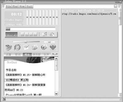 SoGuaPlayer提供了四百多个可选电台节目,任你选择。操作也很简单。直接单击“电台”,在下面的列表中列出了所有的节目,只要点击相应节目(图3),即可从音箱中聆听那优美的电台音乐或节目。