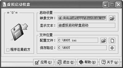提示:你也可以利用WinImage(http://www.winimage.com/winima61.exe)等软件自己制作该映像文件,vFloppy支持2.88MB和1.44MB两种软盘映像文件。