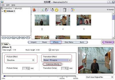 接下来让我们为相册设置一下特效吧。单击预览区上面的“Effects”(特效)按钮,还是在左下角的部分进行选择,至于都是些什么特效,大家试试就知道了。因为在右下角有预览的啊。只要我们分别在“Picture Effect”(图片特效)部分和“Transition Effect”(转换特效)部分分别设置好特效,然后单击“Customize Effect”(定制特效)按钮,就可以预览特效了(图3)。