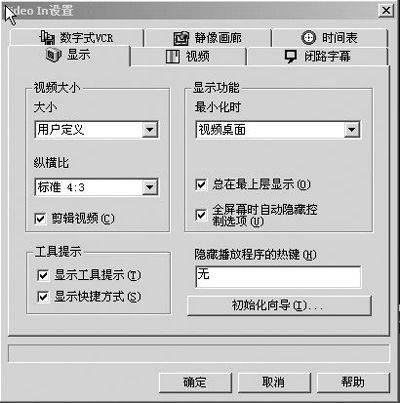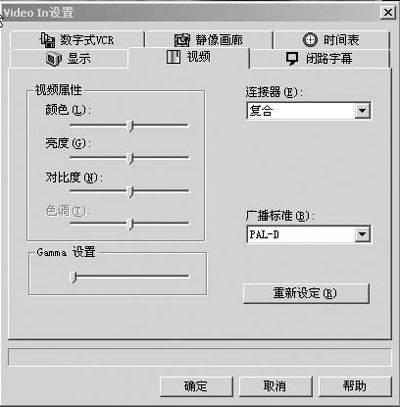 首先接好频道增补器和电脑的电源,进入操作系统,将鼠标移到右下方任务栏中左键双击小喇叭,打开“音量控制”设置栏,去掉“Line in”栏“静音”前的钩,再移动“音量”滑块调整输入的声音大小。视频信号接收可以使用VIVO显卡所配光盘自带的视频收集工具。笔者的显卡是基于ATI显示芯片的,打开ATI的视频搜集工具《Viedo in》,按下“Ctrl+S”,调出设置界面,鼠标左键单击“视频”选项(图3),“连接器”选择“复合”(如你使用的视频端口是“S-video”输入端子就选择“S-video”),由于我国采用的彩色电视视频制式是PAL,所以“广播标准”选择“PAL”,在“视频属性”中移动滑块,调整“颜色”、“亮度”、“对比度”等项以取得最好的画面效果;再单击“显示”选项(图4),把“视频大小”选项设置为“用户定义”,这样就可以很方便地手动设置电视节目窗口的大小,其他设置以默认设置为好。设置完成后单击“确定”。