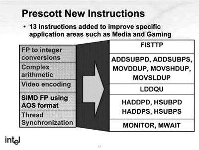 对于软件开发商来说,处理器的硬件性能达到什么层次并不是最主要的,他们更关心新处理器执行指令的效率、有什么新的指令、哪些通过指令的优化技术能使用在新处理器上,从而挖掘到处理器潜在的最大性能。在这方面,Prescott在原本Northwood的SSE2指令集基础上增加了13条全新的指令,其中包括针对超线程、视频优化和支持复杂算术运算的指令。