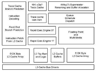 由于目前Prescott还没正式发布,不少细节还有待证实,但从手头的资料我们不难窥视到Prescott的大致形态。在今年春季IDF上,Intel公布了Prescott的核心示意图,根据这个资料,我们可以得到Prescott的某些细节信息,通过与Northwood的核心图相比,我们不难看出Prescott改变部分相当的多。