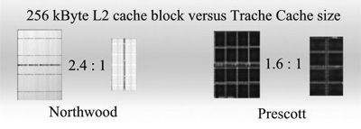 由于Northwood的二级缓存与指令追踪缓存的大小比例为2.4:1;而同样的我们从图中可以看到Prescott相关的比例则为1.6:1,虽然制造工艺不相同,但相关的比例不会改变,所以我们不难推算出Prescott的指令追踪缓存将大于Northwood,从面积上推算其容量将达到16KB。