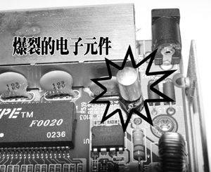 记者多次联系地处广东省的交换机生产厂商,他们先是告诉记者无法修理,后说已经停产,无法找到质量好的产品。不过最终答应给记者更换一台其他型号的交换机。可正当记者放手此事忙于工作时,2003年9月中旬,第二台交换机在张女士家突然发生了内部电子元件爆裂的事故!记者闻讯后立刻赶到现场,一进张女士的客厅就闻到了一股刺鼻的味道,随后记者看到了那台已经被彻底“终结”掉的交换机(见图)。