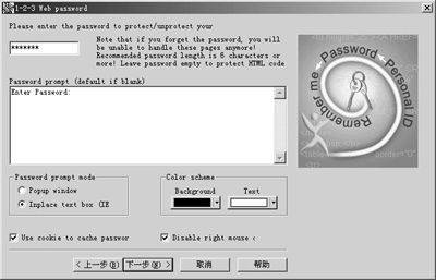 右边的“Color scheme”部分可设置密码输入页面的背景色和文本色。对话框最下方还有“Use cookie to cache password”和“Disable right mouse click”两个复选项,选中前者会为此页面启用Cookie,这会降低网页的安全性,因此不建议选择;而后者则可屏蔽鼠标右键点击,建议选上。