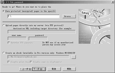 选择“Save protected(encrypted) pages in the specify”可将加密后的网页输出到本地磁盘目录;选择“Upload pages directly into my server”则可直接将页面上传到服务器上更新;选择“Create an e-book”可制作生成加密电子书(exe格式),不过这个功能仅对WinNT/2000/XP操作系统有效。