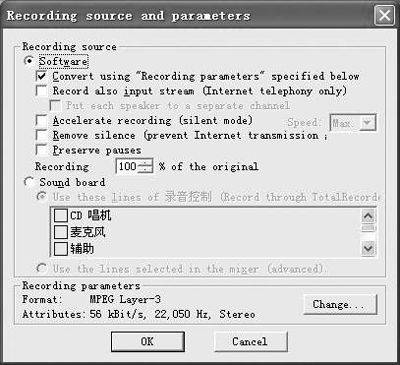 安装运行Total Recorder,在主界面中点击“Options→Recording source and parameters”,在弹出对话框中查看“Recording source”项目,首先选择音频的来源,激活“Software”选项,其次再勾选“Convert using Recording parameters specified below”复选框(图1),以使程序能录制互联网上的声音。