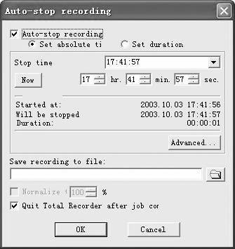 如果你能确认当前欲录制音频所耗用的时间,则可点击菜单栏上的“Play/Record→Auto-stop recording”,弹出如图3所示对话框,在此要确保勾选“Auto-stop recording”复选框(若激活“Set absolute time”选项,表示设置绝对时间)。在其下属参数“Stop time”项目中设置当××(小时):××(分钟):××(秒)时间后就停止录制。此外在“Advanced”中还可以选择录制文件的大小等,就不多讲了。