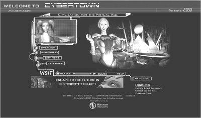 现在,大家就来看看著名的Web3D-VR社区──http://www.cybertown.com吧(图1)!网站被策划为一个远在2090年的未来世界。网站界面设计也具浓郁的科幻风格,那个画面中央的未来少女,几乎已经成为了网络三维社区中的“明星”。全世界注册网友有几百万之多,内部的三维场景数量,达到了188个,面积之大,真可以算是一个城市了!