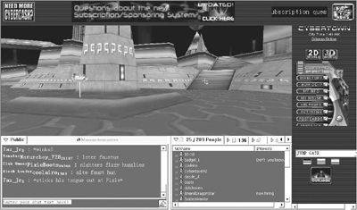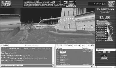 说了这么多,还是自己亲自踏上CyberTown网络三维世界的神奇之旅吧!点击网站首页上右下角的“Login/Join”注册成为会员。也可直接以网页左上角的“Visitor”作为访问者进入,不过只能看着别人聊天。该社区中,聊天分为两种方式:Java的平面聊天和基于虚拟现实技术的三维聊天。一开始,我们到达的会是Java平面聊天区,老外不少,想练外语的朋友有福气了,当然,里面也有不少华人朋友的(图2)……