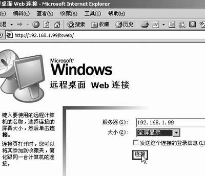 2 在安装有IE 4.0以上的计算机中,打开IE浏览器,在地址栏处输入“http://192.168.1.99/tsweb”(其中192.168.1.99是安装有“远程桌面Web连接”组件的计算机)之后,将进入图4所示窗口。