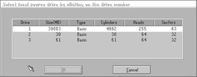 笔者把一个带启动功能的火钻32MB闪存插在另一个USB接口上,直接从火钻启动运行Fdisk,这下又不认64MB这个新闪存了!笔者试着运行了火钻上的ghost,选择“disk to disk”,居然看到ghost将硬盘显示为drive 1,火钻显示为drive 2,新闪存显示为drive 3(见图)。将火钻作为源盘,新闪存作为目标盘,用“disk to disk”方式克隆,几秒钟后,克隆完毕,重新启动后,拔出火钻,进入BIOS设置程序,设置为USB-ZIP启动,哈哈,熟悉的启动菜单出来了,克隆启动盘成功!