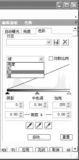 2.点右边编辑面板主菜单的第一个曝光按钮。在色彩调整控制面板中有三个选项,“自动曝光、亮度、色阶”对于前两个操作非常简单,这里有特色的色阶调整(图3)。它可以对图像的通道进行单独的调整。与Photoshop中的色阶模式一样,这里它更直观方便。例如这里我们选择绿色通道,将中间色减少一点,发现原来的图像效果好多了。