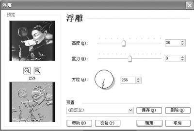 2.选择“浮雕”效果并双击,进入浮雕调节控制面板,这里设置非常简单,在预览框中将图像缩小到25%,通过调节浮雕的“高度”和“重力”来达到最佳状态。在下面的方位调节十分重要,它可以调节浮雕的亮光和阴影的布局(图5)。