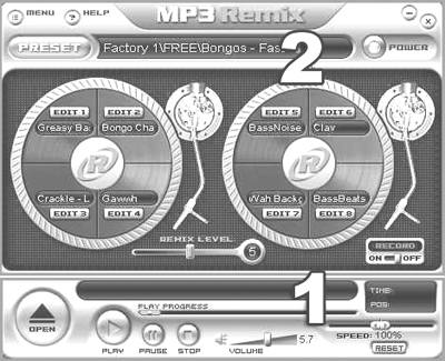 首先我们来看一看它的界面(图1),整个界面分为2部分。1区为播放区,实际上就是一个MP3播放器。2区为混音区,是整个软件的最重要的部分,你的打碟效果全在这里实现,两个环状物就是混音碟,每个碟分四个区,每个区实现一种效果。在这里你可以充分发挥你的音乐天赋,DIY自己的音乐。而在混音碟的最上面则是效果预制区,有点类似Winamp里均衡器中的预制功能。点PRESET可以看到许多已经预制好的声音效果的组合。介绍完界面,现在给大家介绍一下如何使用(图2)。