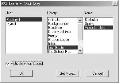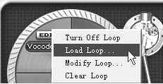 箭头1处为文件菜单,用它可以通过互联网下载更多的效果预制而且还能与朋友分享自己定制的效果预制,不过需要你付费购买MP3 Remix plus才能拥有这一功能;箭头2处为帮助文件;箭头3处为混音开关;箭头4处为预制键,在这里可以选择各种效果的组合,免费的版本只能选FREE模式;箭头5处为混音区,这里就是发挥你的聪明才智的地方了,你可以根据自己的喜好来搭配不同的声音处理不同的节奏,从而创造出属于你自己的音乐。如果预制的效果组合自己不满意的话,你可以选每个效果区的EDIT键,然后在弹出的菜单中选LOAD LOOP(图3、图4)。