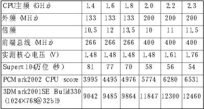 在整个超频测试过程中,新Duron表现出了非常惊人的超频性能。在默认的1.5V电压下(在笔者主板上实际测试为1.48V),笔者接连将它超到了1.6GHz、1.8GHz和2.0GHz,均非常稳定。有意思的是,笔者的KT600主板在开机画面上竟将1.4GHz、1.6GHz、1.8GHz的Duron分别误认为Athlon XP 1600+、1900+和2200+。而在超到2.2GHz和2.3GHz时,CPU核心电压分别加到1.625V和1.775V也能稳定工作(实测分别是1.61V和1.76V)。但是在向更高主频的2.4GHz挑战时,笔者却遇到了前所未有的困难──CPU核心电压加到危险的1.95V后仍然不能稳定地通过所有测试。看来2.3GHz已经是这块CPU的频率极限。于是笔者只得出了从1.4GHz到2.3GHz的测试成绩(见下表)。