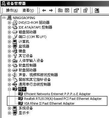 如果要实现两台电脑共享上网,那么板载网卡就更有用武之地了,只要你再安装一块PCI网卡就可以了。不过这里需要提醒一下,双网卡的安装最容易导致设备冲突而无法使用。所以,在板载网卡的主板上使用双网卡,第一步不要先把PCI网卡插到主板上,应先安装好板载网卡驱动,然后重新启动电脑进入BIOS设置中,把板载网卡选项功能关闭;然后再把PCI网卡插入到主板PCI插槽中,开机进入系统后驱动好PCI网卡;接着再回到BIOS设置中把板载网卡选项功能打开,最后开机进入系统后就可以在“设备管理器“中看到两块网卡已经成功驱动好了(图1)。板载网卡的好处就是不占用PCI位置,减少了因PCI插槽共用IRQ导致的设备冲突。