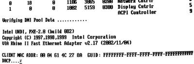 大家一定见过普通的PCI网卡具有一个扩展ROM 槽吧,如果要制作无盘工作站,那么必须把相关的ROM芯片放到这个扩展槽中,这样网卡才具有无盘工作站功能。但是,板载网卡的主板就不一样,只要我们把这个功能打开即可配置无盘工作站,首先我们需要把“Onboard lan Boot ROM”设置为“Enable”打开无盘工作站功能,然后把引导开机设置“First Boot Device“设为“LAN”,保存退出后即可实现无盘工作站功能引导机器启动了。开机后系统就会提示找到无盘网卡(图3),然后进行相关配置就可以了。