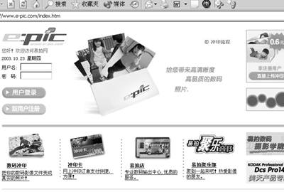 “易拍网”(http://www.e-pic.com)提供网上冲印服务及个性化礼品制作服务。价格比较便宜,冲印3×5(英寸)的照片,一张0.6元。这里提供的影像礼品制作服务,可将你的任何数码影像和数码相片制作成各式各样的个性化商品。如照片、T恤、马克杯、像章等,作为节日礼品送给亲朋好友肯定很有意义。易拍网支持非注册用户直接上传冲印,不过注册用户可以免费获得一个25MB的数码相册。这里一次可以上传5张相片,而且有10MB的空间让你暂时存放相片。