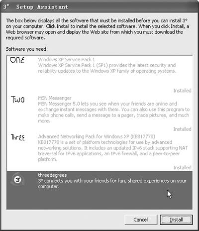 运行下载的程序便可启动安装向导,如果弹出的第一个界面中的蓝色块没有覆盖在“Three degrees”项上(图1),可根据蓝色块所停留的位置对该项进行安装,然后单击“Install”按钮,按照一般应用程序的安装方法即可轻易完成3°的安装。