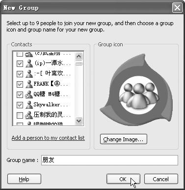 如果要修改该组的图标,可单击“Change Image”按钮再通过浏览窗口选取即可。完成后单击“OK”按钮创建完一个新组,利用这种方法便可为“同事”、“同学”等分别创建新组。