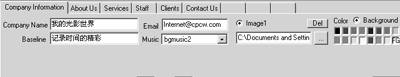 单击“Company Information”标签(图1),在“Company Name”中输入网站名称,在“Baseline”可以输入欢迎光临之类的词语,在“E-mail”中输入网站的联系邮箱,然后单击“Refresh Preview”按钮即可在窗口上面的预览图中看到修改后的效果。在“Music”下拉框中可以为网站设置背景音乐。A4Desk内置有多种背景音乐可以直接选择,当然你也可以在下拉框中选择“Import music”来导入其他的背景音乐文件,而且它支持直接导入MP3格式的背景音乐文件,非常方便。选择右边的“Image1”,然后单击下面的“…”按钮,可以在网站页面右方的图片位置添加图片,在预览图中你可以看到图片的编号和分辨率信息。不过默认情况下预览图太小,可能看不清楚文字,这时可以在预览图上单击鼠标右键,选择“放大”,就可以看清楚预览图中的内容了。