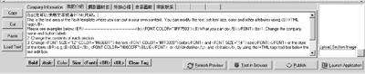 除了“Company Information”标签以外,后面的每个标签都代表着网站菜单栏中的一个菜单。标签名称实际上就是网站中的菜单名称。双击标签名称可以修改菜单名称,单击标签则可以对点击菜单后打开的页面进行设置。注意这里不仅可以直接输入文字内容,而且可以输入HTML代码来控制页面文字的显示样式,比如大小、字体、颜色等。当然你也可以再添加其他的超链接或者图片之类的内容。在右边的“Upload Section Image”可以上传需要用到的图片,如果你以前已经做好了菜单页面,还可以直接用左边的“Paste”按钮把页面代码粘贴过来即可,非常方便(图2)。