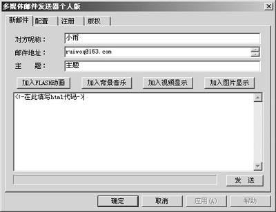 3.“主题”是对邮件内容加以说明的,可以不填。邮件体内请填写HTML代码,因为多媒体邮件必须采用HTML格式。如果你会编写HTML,建议在文本框内手动输入HTML代码,以精确控制多媒体内容在邮件中的显示;如果不会编写HTML代码,系统也可以自动生成。你只需要按下邮件体上面的“加入Flash动画”、“加入背景音乐”、“加入视频显示”、“加入图片显示”四个按钮中的一个或几个,选择你要的多媒体文件,点“确定”返回,系统生成的HTML代码立即出现在邮件体的文本框内。