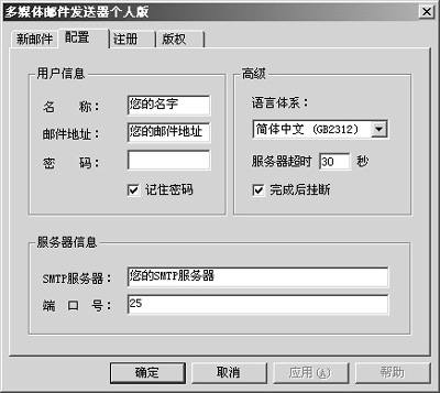4.单击“配置”标签,出现图2所示的窗口,在“用户信息”一栏中,填入你的名字(可以不填写任何内容)、邮件地址和密码(E-mail对应的密码)。“服务器”一栏中填入发送邮件的服务器和端口。“SMTP服务器”是由你的ISP或免费邮件服务商提供的。“服务器端口”是一个数值,默认是25(可以向ISP或免费邮件服务商咨询确定端口号)。设置好后,回到图1所示的窗口,单击“发送”按钮就可以了。