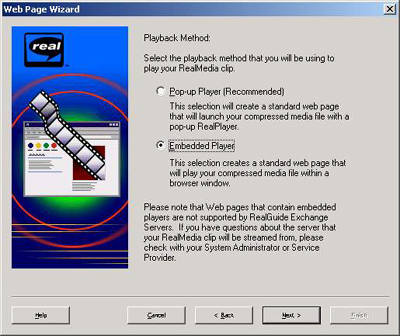 在局域网的服务器上安装RealProducer Plus,并运行这个软件。选择菜单中“Tools”项下的“Creat Web Page”,出现“Web Page Wizard”窗口后再进入下一页;选择添加“C:\Inetpub\wwwroot\media\”目录下的文件“adzdg.rm”,并点击“Next”进入下一页;再选择“Embedded Player”(图1),点击“next”;选择“Standard Player”,并勾选“Auto start”,点击“Next”;在“Caption”下的文本框中输入“萧亚轩──爱的主打歌”,点击“Next”完成设置。此时在“C:\Inetpub\wwwroot\media”目录下将生成文件“adzdg.html”和“adzdg.rpm”,至此,播放RM文件的页面就制作完成了。
