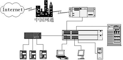 笔者所在公司的局域网有40台计算机,ISP是中国网通,网通将光缆铺设进大楼,大楼内由ISP架设局域网到楼内各公司的网络或单机进行互联网服务,笔者公司通过路由将线路连通,实现内部局域网和互联网、局域网间的VPN以及与总公司的IP电话通讯,大致布局见图。