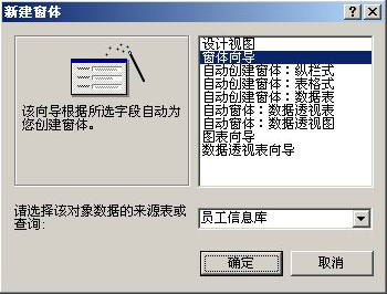 打开前文制作的员工信息数据库窗口面板,单击“窗体”按钮,然后单击工具栏“新建”按钮打开“新建窗体”对话框,选择“窗体向导”列表项,在数据来源中选择“员工信息库”,并单击“确定”按钮,如图1所示。