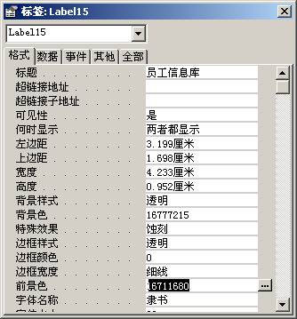 单击标签工具,然后输入文本“员工信息库”,用鼠标右键单击此标签,并从弹出菜单中选择“属性”命令,单击“格式”选项卡,设定字体为“隶书”,字号大小为22,特殊效果设定为“蚀刻”,设定前景色为蓝色,如图4所示。