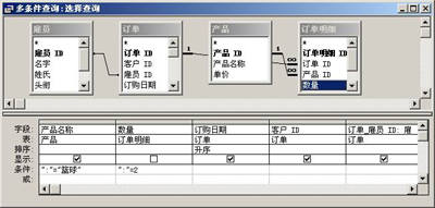 完成查询制作后,将打开多条件查询窗体界面,将它关闭后返回到“查询”面板。单击“设计”按钮打开设计视图窗口,在“产品名称”字段条件中输入查询条件“:=篮球”,然后在它对应的“数量”字段中输入条件“:=2”。为了使查询信息范围更加符合要求,还可以在下面的条件“或”中输入新的规则,并设定“订货日期”的“排序”规则为“升序”,如图1所示。