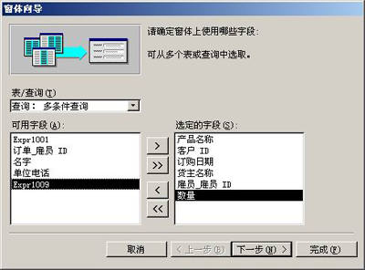 在打开的对话框中,在“可用字段”中选择相应字段,然后双击将它添加到右侧的“选定字段”列表中,并单击“下一步”按钮继续,如图4所示。