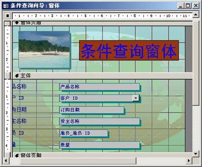 返回到设计视图,拖动图片改变大小至合适的位置。然后选择“标签”工具按钮,在页眉区域输入“条件查询窗体”,如图8所示。