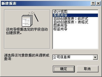 在数据库窗口中单击“表”,然后单击工具栏中的“新建”,打开“新建报表”对话框。选择“报表向导”选项,并从数据源中选择“公司信息库”数据表,然后单击“确定”(图1)。