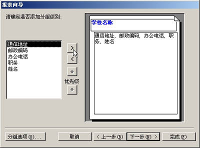 打开“分组级别”对话框,选择“学校名称”作为分组,然后单击“>”按钮添加到右侧预览区,单击“下一步”(图3)。