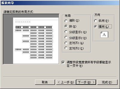 打开“布局方式”对话框,在“布局”中选择“块”,然后在右侧方向中选择“横向”,单击“下一步”(图5)。