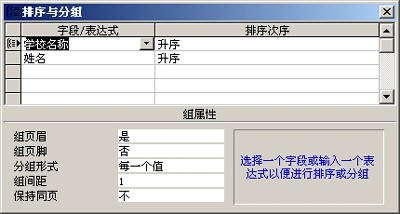 如果要对报表中的数据进行排序,可以在“窗体”视图、“数据表”视图或“页”视图中单击工具栏“排序与分组”按钮,打开排序与分组对话框,在“字段表达式”中选择排序对象,选择要排序或者分组的字段,第一行的字段或表达式具有最高排序优先级,第二行则具有次高的排序优先级(图10)。
