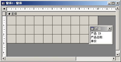 单击数据库窗口中的窗体按钮,然后单击“新建”,打开“新建窗体”对话框。在数据源中选择“产品”表,并在列表框中选择“设计视图”,“确定”后打开设计视图窗口(图1)。