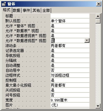 执行主菜单“视图→窗体视图”命令打开窗体视图。然后用鼠标右键单击窗体,并从弹出的快捷菜单中选择“属性”命令,打开“窗体”属性对话框,设置窗体的各项属性,完成后关闭窗体属性对话框(图2)。
