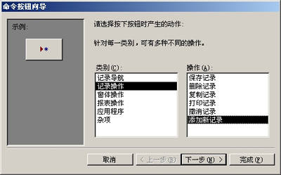 在工具箱中选择“命令按钮”,在页面上建立一个按钮。打开“命令按钮向导”对话框,在左侧“类别”列表中选择“记录操作”,然后在右侧“操作”列表中选择“添加新记录”,然后单击“下一步”(图4)。