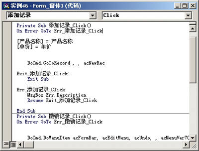下面需要为控件加入相应代码。在“添加记录”按钮上单击鼠标右键,从弹出的菜单中选择“事件生成器”,打开“添加产品记录(代码)”对话框,然后输入如下语句: